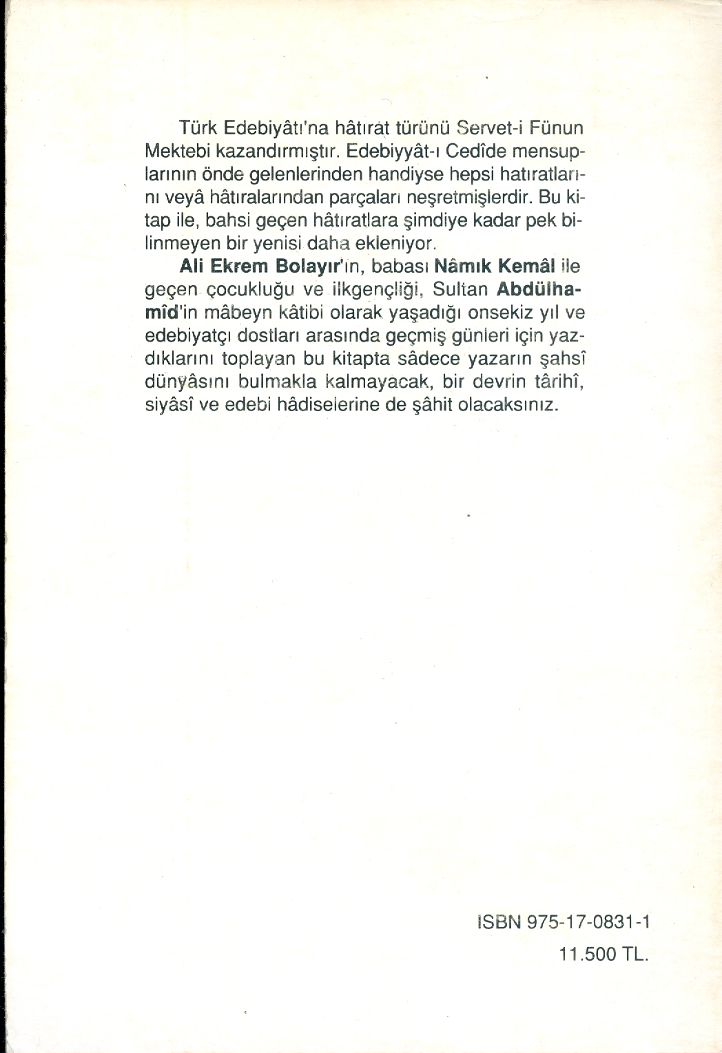 Ali Ekrem Bolayır (1867-1937) Türk edebi ve siyasi hayatının, saray bürokrasisi ve eğitim dünyasının içinde yetmiş yıl geçirmiştir. Vali, muallim ve müderris olarak yaşadığı seneler bir tarafa, onun hayatı üç nam ve unvan ile özetlenebilir: Namık Kemal Beyzade, Katib-i Hazret-i Şehriyari, A. Nadir.