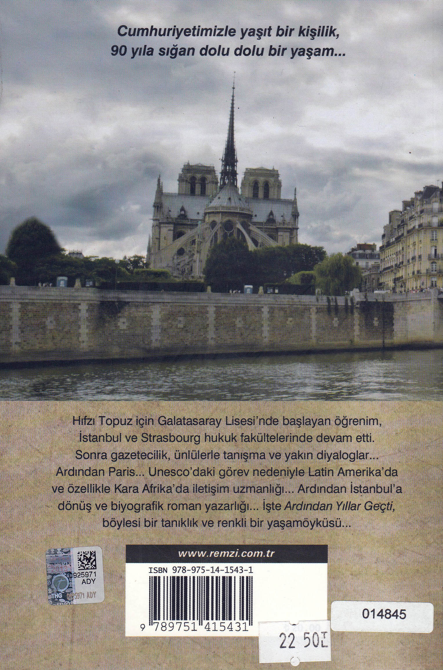Cumhuriyetimizle yaşıt bir kişilik, 90 yıla sığan dolu bir yaşam... Hıfzı Topuz için Galatasaray Lisesi'nde başlayan öğrenim, İstanbul ve Strasbourg hukuk fakültelerinde devam etti. Sonra gazetecilik, ünlülerle tanışma ve yakın diyaloglar... Ardından Paris... Unesco'daki görev nedeniyle Latin Amerika'da ve özellikle Kara Afrika'da iletişim uzmanlığı... Ardından İstanbul'a dönüş ve biyografik roman yazarlığı... İşte Ardından Yıllar Geçti, böylesi bir tanıklık ve renkli bir yaşamöyküsü... 1923 yılında İstanbul'da doğan Hıfzı Topuz, Galatasaray Lisesi'ni (1942), İstanbul Üniversitesi Hukuk Fakültesi'ni (1948) bitirdi. Strasbourg Üniversitesi'nde devletler hukuku ve gazetecilik alanlarında yüksek lisans (1957-59) ve yine Strasbourg Hukuk Fakültesi'nde gazetecilik alanında doktorasını yaptı (1960). 1947-58 yılları arasında Akşam gazetesinde önce istihbarat şefi, sonra yazı işleri müdürü olarak çalıştı. İstanbul Gazeteciler Sendikası'nın kurucuları arasında yer aldı ve başkanlığını yaptı. Paris'te Unesco Genel Merkezi'nde Özgür Haber Dolaşımı şefi olarak çalıştı (1959-1983). Uluslararası gazetecilik örgütleri arasında mesleksel işbirliği, basın ahlâkı, gazetecilik eğitimi ve gazetecilerin korunması projelerini yönetti. Afrika ülkelerinde, Hindistan'da, Filipinler'de gazetecilik eğitimi seminerleri düzenledi. Kara Afrika'da kırsal basın projesini oluşturdu. 1962 yılında Ankara Üniversitesi İletişim Fakültesi'nin, o zamanki adıyla Basın-Yayın Yüksek Okulu'nun kuruluşu için, Paris'te Unesco'nun merkezinde ilk projeleri hazırladı. 1974-75 yılları arasında TRT'de Radyolardan Sorumlu Genel Müdür Yardımcılığı yaptı. 1986'da halen başkanlığını sürdürdüğü İletişim Araştırmaları Derneği'ni (İLAD) kurdu. Vatan, Milliyet ve Cumhuriyet gazeteleriyle çeşitli dergilerde diziler ve inceleme yazıları yazdı. Anadolu Üniversitesi, Galatasaray ve İstanbul Üniversiteleri iletişim fakültelerinde basın, radyo-televizyon tarihi, uluslararası iletişim ve siyasal iletişim dersleri verdi…