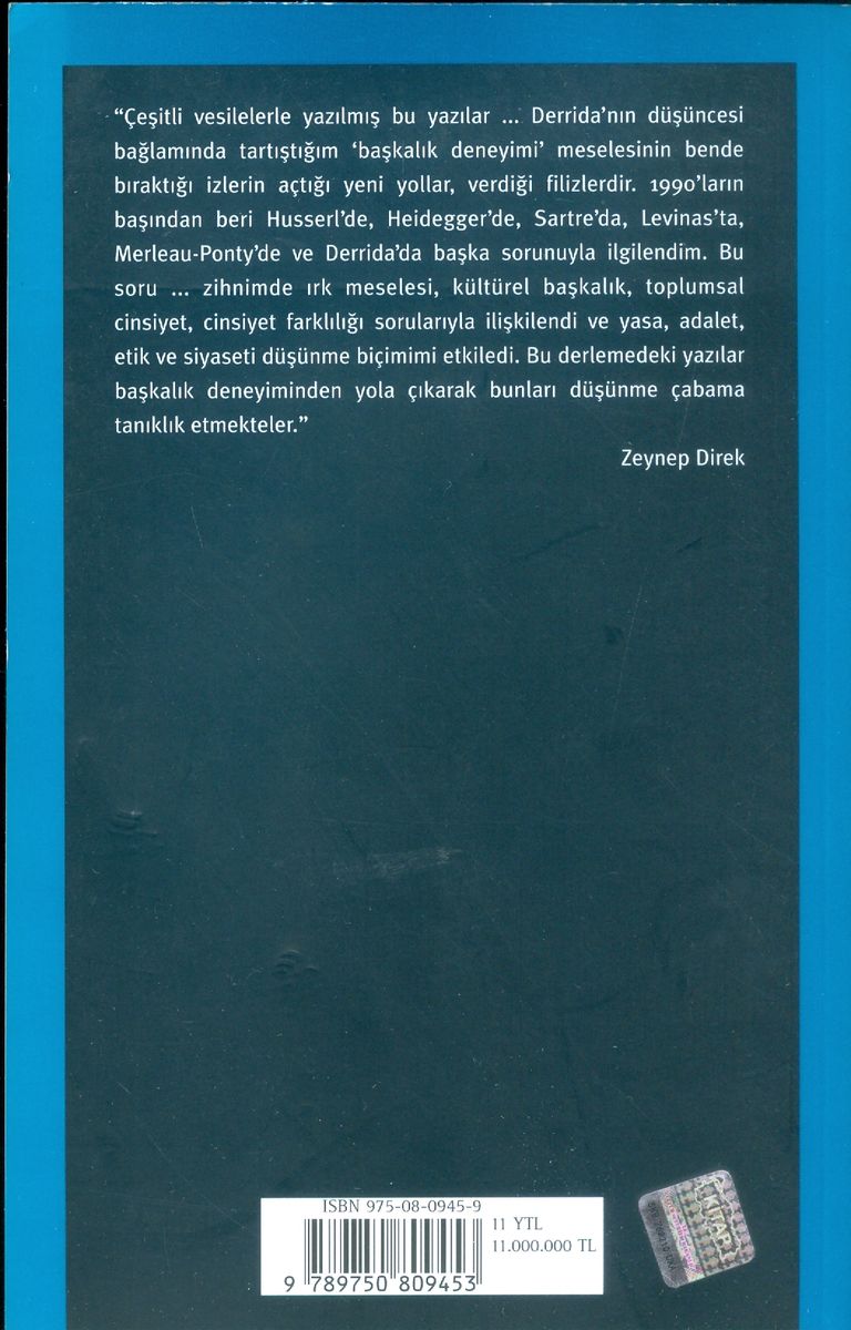 Çeşitli vesilelerle yazılmış bu yazılar doktora tezimde Derrida'nın düşüncesi bağlamında tartıştığım "başkalık deneyimi" meselesinin bende bıraktığı izlerin açtığı yeni yollar, verdiği filizlerdir. 199ü'ların başından beri Husser'de, Heidegger'de, Sartre'da Levinas'ta, Merleau-Ponty'de ve Derrida'da başka sorunuyla ilgilendim. Bu soru tezimi savunduğum 1998'den sonra zihnimde ırk meselesi, kültürel başkalık, toplumsal cinsiyet, cinsiyet farklılığı sorularıyla ilişkilendi ve yasa, adalet, etik ve siyaseti düşünme biçimimi etkiledi. Bu derlemedeki yazılar başkalık deneyiminden yola çıkarak bunları düşünme çabama tanıklık etmekteler. Derrida'yı ve Levinas'ı sunan, tanıtan, açıklayan, kısacası okuyan yazılar var çoğunlukta bu kitapta. Diğer yazılar da onlar tarafından ilham edilmiş. Daha geç tarihte yazdığım yazılar yorumsal pratik açısından ilk yazılara göre daha gelişkindir, çünkü okuma zamanla derinleşmekte ve inceleşmektedir ama ilk yazılarımda da bugün savunamayacağım bir şey olmadığını söyleyebilirim. Çağdaş Kıta Avrupası Felsefesi'ne günümüzün en önemli izlekleri bağlamında girme fırsatı arayan okura destek olacaklarını düşündüğüm için bu yazıları biraraya getirmeye karar verdim. Aslında bunların bir kısmı 1997'den itibaren Defter, Felsefe, Logos gibi dergilerde, bir kısmı da piyasada kolaylıkla bulunmayan bildiri veya Armağan kitaplarında yayınlanmışlardır. İlk basımların künyelerini her denemenin başında belirttim. Yazıları bu kitapta yayınlamadan önce gözden geçirdim ve gerekli bulduğum ufak tefek değişiklikleri yaptım. Charles Bigger, Robert Bernasconi, Leonard Lawlor, Tina Chanter, John Llewelyn hayatımdaki varlıklarıyla bu yazıları kışkırtmış ve beslemiş kişilerdir. Onlar olmasaydı bu kitap da olmazdı. Bana her zaman verdikleri cesaret, destek ve herşeyden önemlisi dostluk için onlara ne kadar teşekkür etsem azdır. Türkiye' deki felsefe camiasından da her zaman sıcak bir kabul ve destek gördüm. Bu yazıların yazılmasına vesile olan konferanslara beni davet etmiş ve çalışmamı desteklemiş olan Ioanna Kuçuradi, Doğan Özlem ve Sinan Özbek' e teşekkür ederim. Semih Sökmen ve Orhan Koçak, Defter dergisinde yayınladığım yazılara soruları ve değinileriyle önemli katkılarda bulunmuşlardır.