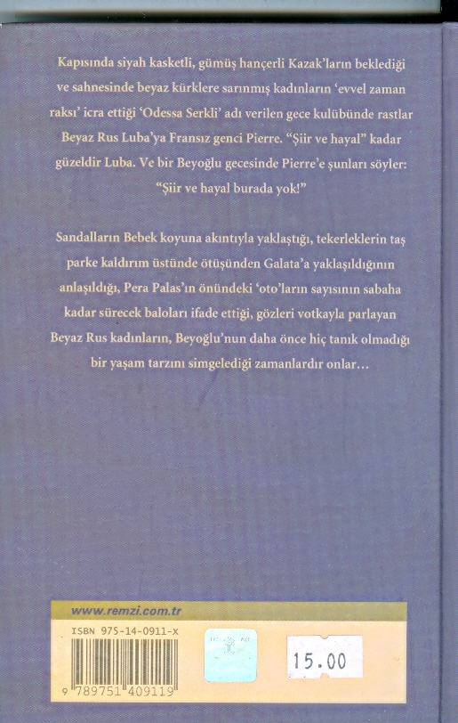 Kapısında siyah kasketli, gümüş hançerli Kazak'ların beklediği ve sahnesinde beyaz kürklere sarınmış kadınların ''evvel zaman raksı'' icra ettiği ''Odessa Serkli'' adı verilen gece kulübünde rastlar Beyaz Rus Luba'ya Fransız genci Pierre. ''Şiir ve hayal'' kadar güzeldir Luba. Ve bir Beyoğlu gecesinde Pierre'e şunları söyler: Şiir ve hayal burada yok!'' Sandalların Bebek koyuna akıntıyla yaklaştığı, tekerleklerin taş perde kaldırım üstünde ötüşünden Galata'ya yaklaşıldığının anlaşıldığı, Pera Palas'ın önündeki ''oto''ların sayısının sabaha kadar sürecek baloları ifade ettiği, gözleri votkayla parlayan Beyaz Rus kadınların Beyoğlu'nun daha önce hiç tanık olmadığı bir yaşam tarzını simgelediği zamanlardır onlar...