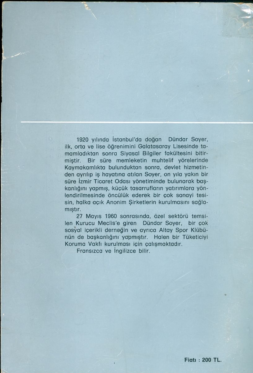 Bu kitapta son on yıldır, Türkiye'nin siyasal ve ekonomik hayatı üzerinde açıkladığım düşüncelerimi, izlenimlerimi ve önerilerimi yenilemeye ve yeniden yorumlamaya çalıştım. Her zaman benden farklı düşünmeleri nedeniyle, çıkarları bakımından, muhtemel baskılara yönelmek eğiliminde olanlara, medeni bir şekilde fikir haysiyetimden fedakarlık yapmadan göğüs germeğe çalıştım. Toplantı. Seminer, konferans ve düşünce tartışmalarında, görüşlerimi açıkça belirtmeyi şiar edindim.