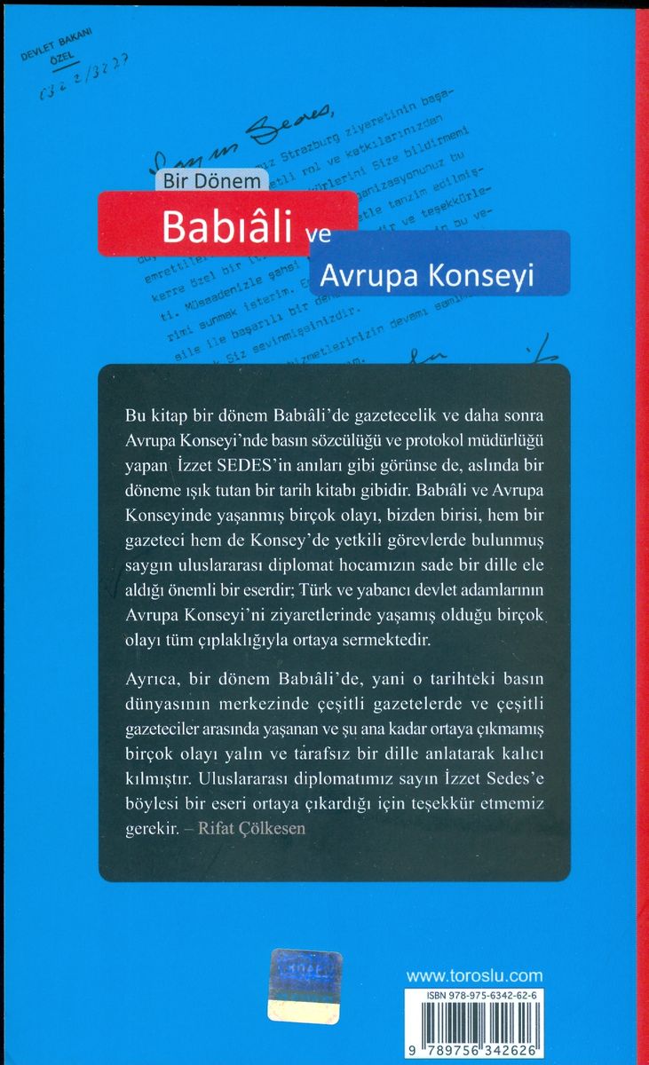 İzzet Sedes'in elinizdeki kitabını okuyunca, dediklerimizin örneklerini bol bol buluyorsunuz. Onunla kalmıyor, Avrupa Konseyi'nde yaptığı "Protokol Şefliği" görevi sırasındaki başarılarının gerisinde de aynı dürüst ve zarif kişiliğin büyük payı olduğunu görüyorsunuz.
