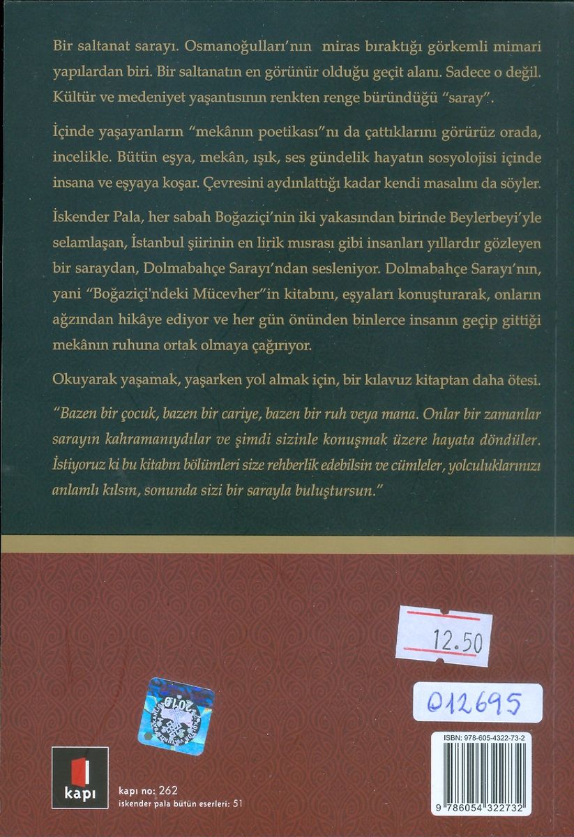 İstanbul'a yol uğratanların bir gün mutlaka deniz veya kara yoluyla önünden geçtikleri Dolmabahçe Sarayı, aslında gizemlerle dolu estetik bir mekân olarak her an yeniden keşfedilmeyi bekleyerek ayakta duruyor ve zamana direniyor. Tanzimat sonrası yeni bir başlangıcın merkezi olarak önce saltanata, ardından monarşik parlamenter sisteme ve nihayet Cumhuriyet yönetimine tanıklık etmiş olması bakımından pek çok hatıralar burada istiflenmiş durumda. İşte bu yüzden, Türk modernleşmesinin başlangıcında inşa olunan bu ihtişamlı saray, gerek yapılışındaki güzellik, gerekse içindeki zarif hayatın yeniden kazanımı bakımından yeni bakış açılarına ve orayı yeniden görecek gözlere muhtaç. 6 padişah, 1 halife ve 2 cumhurbaşkanının yaşadığı bir mekândan ve oradaki zengin hatıralardan bahsediyoruz. Bir dönemin sanat, müzik, mimari vb. estetik değer ilhamlarının merkezi olarak Boğaziçi'nde pırlanta bir güzellikten söz açıyoruz.