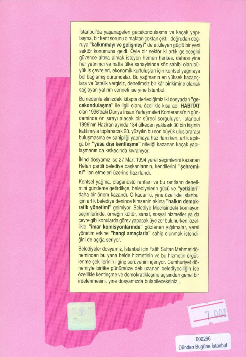Bu nedenle elinizdeki kitapta derlediğimiz iki dosyadan "gecekondulaşma" ile ilgili olanı, özellikle kısa adı HABITAT olan 1996'daki Dünya insan Yerleşmeleri Konferansı'nın gündeminde ön sırayı alacak bir süreci sorguluyor. İstanbul 1996'nın Haziran ayında 184 ülkeden yaklaşık 30 bin kişinin katılımıyla toplanacak 20. yüzyılın bu son büyük uluslararası buluşmasına ev sahipliği yapmaya hazırlanırken, artık açıkça bir "yasa dışı kentleşme" niteliği kazanan kaçak yapılaşmanın da kıskacında kıvranıyor.