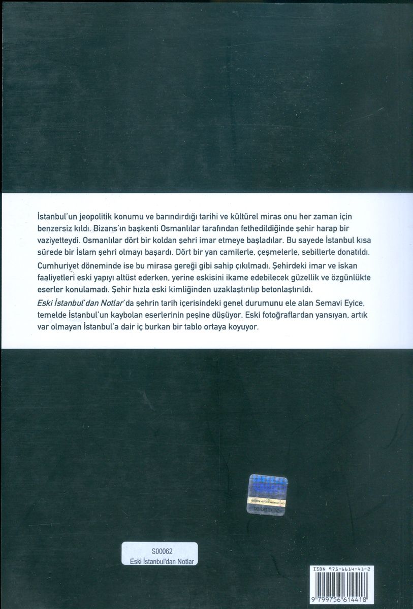 Eski istanbul'dan Notlar'da şehrin tarih içerisindeki genel durumunu ele alan Semavi Eyice, temelde İstanbul'un kaybolan eserlerinin peşine düşüyor. Eski fotoğraflardan yansıyan, artık var olmayan İstanbul'a dair iç burkan bir tablo ortaya koyuyor.