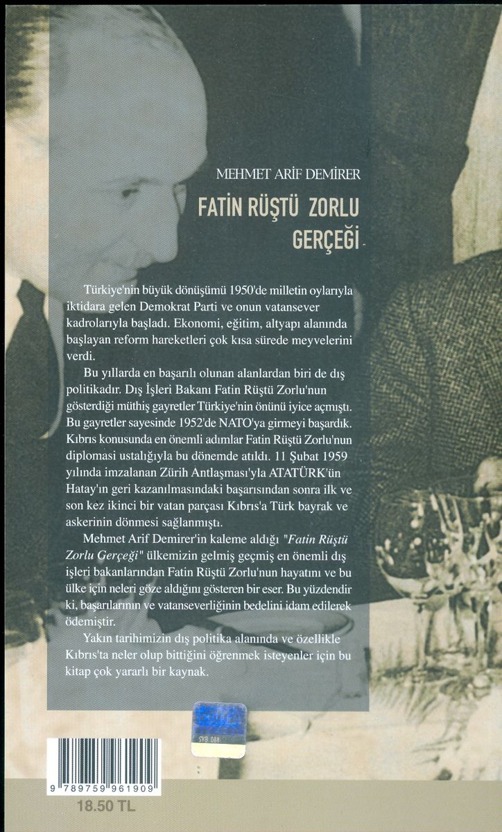 Mehmet Arif Demirer 'Fatin Rüştü ZORLU ve Türkiye için Çırpınışlarının Öyküsü' başlıklı kitabı ile Türk diplomasi tarihinin bugün hala etkilerini hissettiğimiz çok kritik bir döneminin aydınlatılmasına katkıda bulunduğu gibi, peşin hükümlerin, hukukun pervasızca ihlalinin ve vicdani sorumsuzluğun bir büyük vatanseveri nasıl ölüme sürüklediğini bize belgelere dayanarak anlatmaktadır. NATO Delegasyonunda görev gördüğüm yıllarda Büyükelçim olan Fatin Rüştü ZORLU, politikada ve diplomaside olduğu kadar özel hayatında da risk almaktan çekinmeyen, Yassıada'daki yargılanmasında ve idam cezasının infazı sırasında gösterdiği gibi, son derece metin ve cesur bir insandı. Altın gibi bir kalbi vardı, kuyusunu kazmak isteyenlere bile kötülük edemezdi. Dışişleri Bakanlığında kabiliyetli gördüğü gençlere daima destek verir ve onları teşvik ederdi. ZORLU, NATO üyesi olduktan sonra Türkiye'nin ittifak içinde siyasi ve askeri gücünün geliştirilmesi hedefini gütmüş, özellikle Türk ordusunun modernleştirilmesi sağlayan dinamik bir sürecin öncülüğünü yapmıştır. Türk ekonomisinin güçlendirilmesi de onun öncelikleri arasındaydı.
