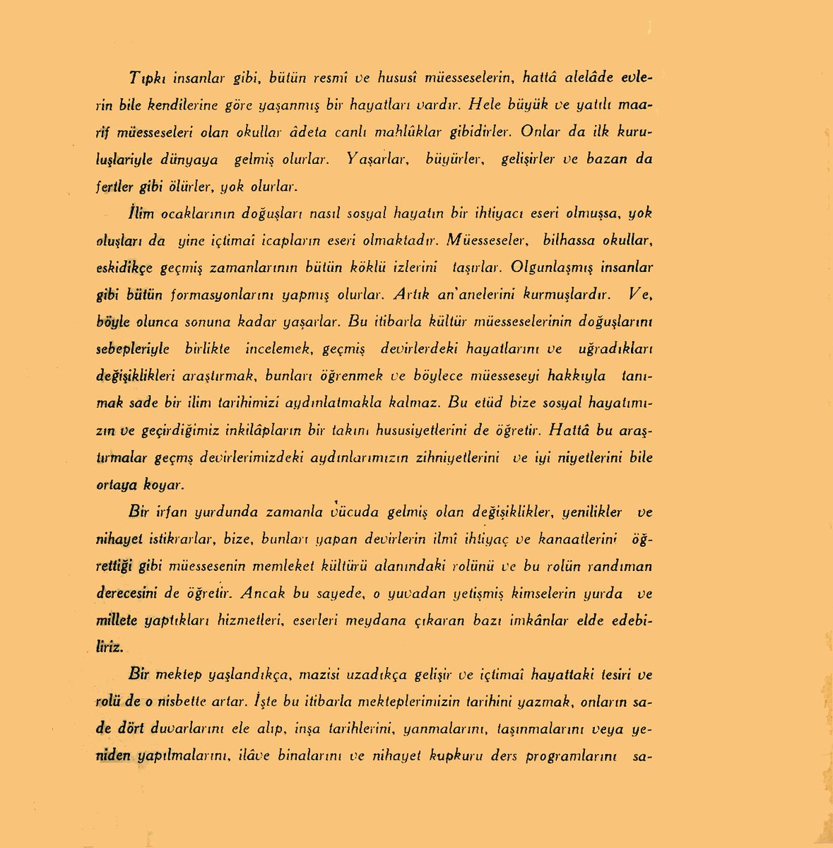 Bir mektep yaşlandıkça, mazisi uzadıkça gelişir ve içtimaı hayattaki tesiri ve rolü de o nispette artar. İşte bu itibarla mekteplerimizin tarihini yazmak: onların sade dört duvarlarını ele alıp, inşa tarihlerini, yanmalarını, taşınmalarını veya yeniden yapılmalarını, ilave binalarını ve nihayet kupkuru ders programlarını sayıp dökmek değildir,