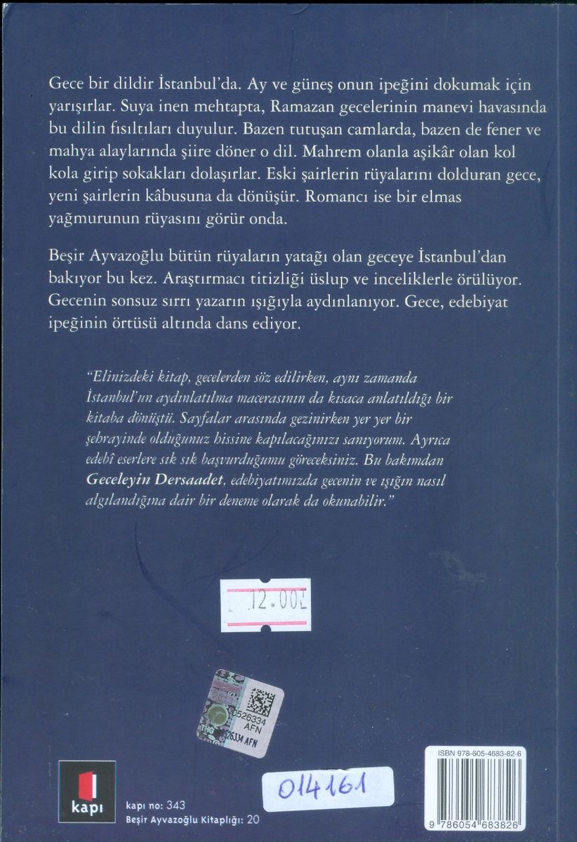 Beşir Ayvazoğlu bütün rüyaların yatağı olan geceye İstanbul'dan bakıyor bu kez. Araştırmacı titizliği üslup ve inceliklerle örülüyor. Gecenin sonsuz sırrı yazarın ışığıyla aydınlanıyor. Gece, edebiyat ipeğinin örtüsü altında dans ediyor.