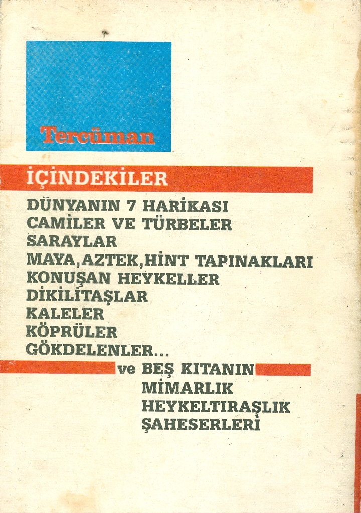 7'den 70'e herkesin zevk ve merakla okuyacağı bu eser dünyanın başlıca harikalarını tanıtmakla kalmıyor, onları meydana getiren milletlerin tarihlerini, o çağlardaki inanış ve efsanelerini de yansıtıyor. Ayrıca daha yakın tarihlerde yapılmış, eskilerle yarışan dev eserleri de sergiliyor.