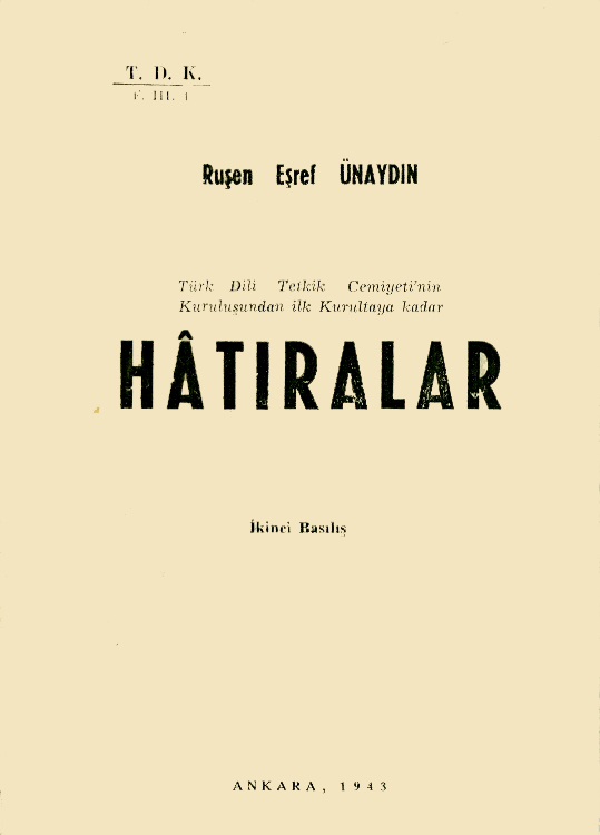 O zaman Kurumu'n ilk ve Kurucu Genel Sekreterliğine seçilen Ruşen Eşref Ünaydın, 1932 Temmuzunun 12'nci gününden başlayarak, bütün dil ve' Kurultay çalışmalarının canlı bir heykeli kesilmişti. Büyük bir devrimin bu ilk görünüş çalışmalarındaki' değerli hatıralarını 1933 de ancak kendisine yaraşır bir güzel anlatışla kaleme almış idi.
