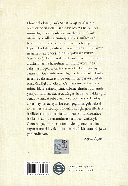 Kuşkusuz, bu kitap, Osmanlı’nın erken dönemlerinden başlayarak, mimarlık alanında yüzyıllar boyunca kullanılan terimleri ihtiva eden bir külliyât niteliği arz etmediği gibi, bu hâliyle, Osmanlı mimarlığı ve yapı malzemesine ilişkin tarihsel adlandırma ve sorunsallara bütüncül bir çözüm sağladığı da iddia edilemez. Buna karşılık, günümüz Türkçesine çevirdiğimiz bu küçük sözlüğün, hiç değilse geç Osmanlı çağı mimarlığına ilişkin pek çok ayrıntının çözümlenmesine yardımcı olacağı ve bu alanda çalışanlar için önemli katkılar getireceği kanısındayım....