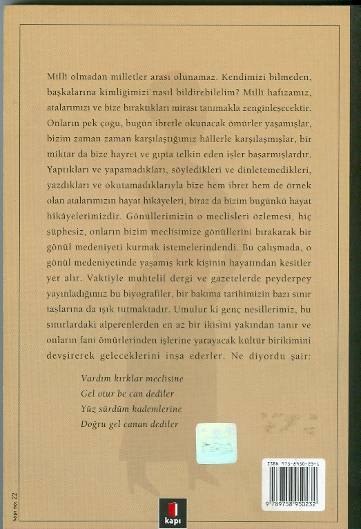 Milli olmadan milletler arası olunamaz. Kendimizi bilmeden, başkalarına kimliğimizi nasıl bildirebilelim? Milli hafızamız, atalarımızı ve bize bıraktıkları mirası tanımakla zenginleşecektir. Onların pek çoğu, bugün ibretle okunacak ömürler yaşamışlar, bizim zaman zaman karşılaştığımız haillerle karşılaşmışlar, bir miktar da bize hayret ve gıpta telkin eden işler başarmışlardır. Yaptıkları ve yapamadıkları, söyledikleri ve dinletemedikleri, yazdıkları ve okutamadıklarıyla bize hem ibret hem de örnek olan atalarımızın hayat hikâyeleri, biraz da bizim bugünkü hayat hikâyelerimizdir. Gönüllerimizin o meclisleri özlemesi, hiç şüphesiz, onların bizim meclisimize gönüllerini bırakarak bir gönül medeniyeti kurmak istemelerindendi. Bu çalışmada, o gönül medeniyetinde yaşamış kırk kişinin hayatından kesitler yer alır. Vaktiyle muhtelif dergi ve gazetelerde peyderpey yayınladığımız bu biyografiler, bir bakıma tarihimizin bazı sınır taşlarına da ışık tutmaktadır. Umulur ki genç nesillerimiz, bu sınırlardaki alperenlerden en az bir ikisini yakından tanır ve onların fani ömürlerinden işlerine yarayacak kültür birikimini devşirerek geleceklerini inşa ederler...