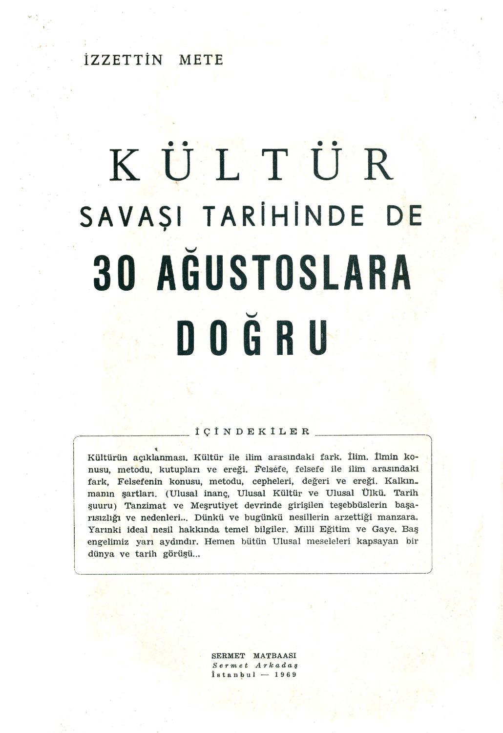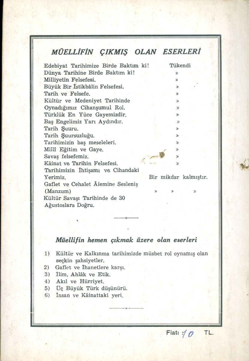 Üç asırdan beri sürüp giden başarısızlıklar, bütün sıkıntılar, ulusal şuurdan, ulusal ülküden uzaklaşmış ya da uzaklaştırılmış olmamızla açıklanabilir. Bu gerçeği engin ve eşsiz dehasıyla en derinden kavrayan Mustafa Kemal olmuş ve Türk'e kendisini tanıtmak için, o eşsiz tarih görüşünü vicdanlarımıza aksettirmiştir. İşte Türk kendisini kendi tarihinde seyrettikten sonradır ki, uyanmış, ileri atılarak büyük işler başarmış, büyük vazifeler görerek cihanda ün almıştır. Evet asırları korku ile ayağa kaldırarak tarih destanını yaratmış, haçlı ordularına karşı İslamiyeti kurtararak yükseltmiştir. Kahraman Türk Irkının, bugün içine düşürüldüğü durumdan da kurtulması ve milli benliğimizin eski muhteşem zirvesine yükseltilmesi için, tek bir çare vardır ki, o da yalnız ve ancak, ulusal şuurla, ulusal benlikle, ulusal kültürle mümkündür. Evet bugünkü maddi ve manevi sarsıntılar, ulusal kültür ve ulusal ülkü yokluğunun arızalarında başka bir şey değildir. Eğer, geleceğe güvenle bakmak ve tarihin kötü tekerrürlerini durdurmak azminde isek, bu gerçekler önünde mutlaka durmalıyız. Mantık gibi bitaraf ve evrensel ilimlerin de teyit ettiği bu gerçeklerin öneminden gaflet edenlerin emdikleri sütten ve damarlarında taşıdıkları kandan mutlaka şüphe edilmelidir.