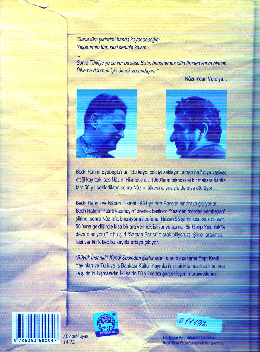 Bedri Rahmi Eyüboğlu arşivini büyük bir titizlikle yayına hazırlayan Hughette Eyüboğlu, artık zamanı geldiği düşüncesiyle makara bandı sakladığı çekmeceden çıkardı ve Bedri Rahmi'nin bütün eserlerini yayımlayan İş Bankası Kültür Yayınları'na teslim etti. Evet, bu bant uzun yıllar saklanmak zorunda kaldı, çünkü kayıttaki ses yıllarca yasaklıydı. Bedri Rahmi o yıllarda evlerini sık sık ziyaret eden polislere karşı önlemini daha kayıt sırasında almıştı; kaydın başında "Mor" şiirini okuyup adeta kendi sesini Nazım'a siper ederek... Bant evin çeşitli yerlerinde saklandı, kimi zaman yüklükte, kimi zaman merdiven altında, Mehmet Eyüboğlu'nun çekmecesinde... O kadar ki, Hughette Hanım, "artık zamanı geldi" dediğinde bandın bulunması bir hafta sürmüştü. Aradığı bir şey daha vardı: Nazım'ın annesi Celile Hanım'ın yaptığı ve hiç ortalığa çıkmamış bir Nazım portresi. Ekinde CD olan bu kitabın ön kapak içinde gördüğünüz Celile Hanım'ın resmettiği portre de, Nazım'ın Bedri Rahmi'ye yadigârıdır.