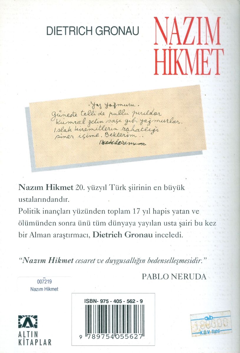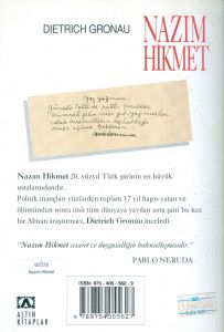 Birinci çalışmasındaki bize olan yakınlığı ve sevecen tutumu, Gronau'yu bu kez de Türk şiirinin uluslararası üne sahip büyük ustası Nazım Hikmet konusunda araştırmalara yöneltmiş. Elinizdeki bu "Nazım Hikmet" monografisi böylesi içten bir çabanın ürünüdür.