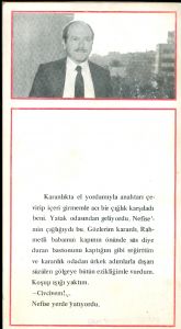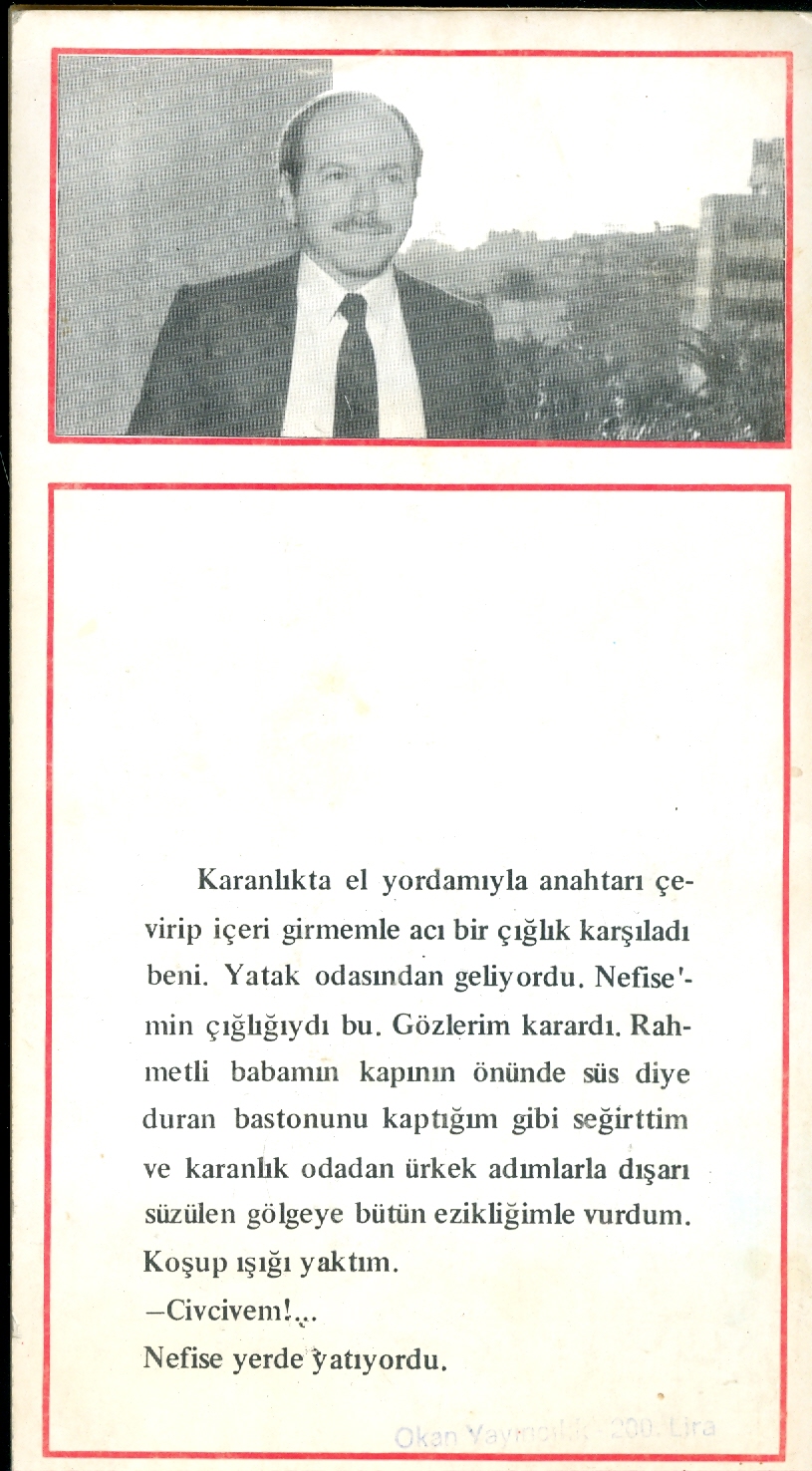 Karanlıkta el yordamıyla anahtarı çevirip içeri girmemle acı bir çığlık karşıladı beni. Yatak odasından geliyordu. Nefise'min çığlığıydı bu. Gözlerim karardı. Rahmetli babamın kapının önünde süs diye duran bastonunu kaptığım gibi seğirttim ve karanlık odadan ürkek adımlarla dışarı süzülen gölgeye bütün ezikliğimle vurdum. Koşup ışığı yaktım.