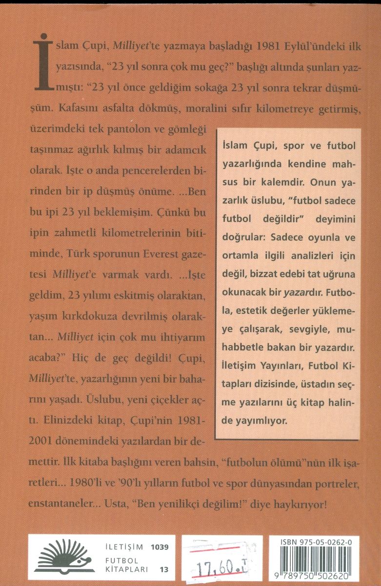 İlk derlemede İslam Çupi'nin 1990 sonrasında yazdığı, daha çok "futbolun" etrafında toplanan yazılarını okura sunmayı istemiştik. Bu derleme ise Milliyet'te çalışmaya başladığı 1981 yılından ölümüne kadarki dönemi, kısaca "sadece" Milliyet dönemini kapsıyor. Kitap, hem 80'li yıllarda yazdığı yazıları hem de ilk derlemeye alamadığımız ama kitapta mutlaka yer almaları gerektiğini düşündüğümüz 90'lı ve 2000'li yıllar yazılarını bir araya getiriyor. Futbolcu ya da spor adamı portreleri, futbol dışı spor alanlarında kalem oynattığı yazılar, memleket futbolunun yirmi yıllık ortamı, spor/futbol yazmanın nasıl bir şey olduğuna, Çupi'de neye tekabül ettiğine dair yazılar, maç yazılarından ufak bir demet. İslam Çupi külliyatından küçük bir parça daha; en azından "nefis köreltmeye" yetecek kadar büyükçe ama...