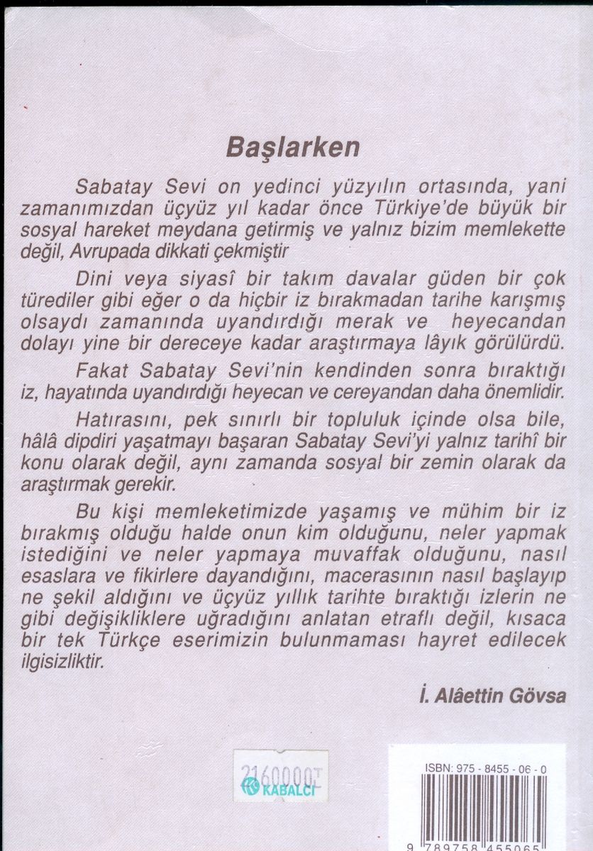 Sabatay Sevi miladın on yedinci asrı ortasında, yani zamanımızdan üç yüz sene kadar evvel Türkiye'de büyük bir içtimai ve siyasi hareket meydana getirmiş ve yalnız bizim memlekette değil, bütün Avrupa'da dikkati celbetmiş bir adamdır.