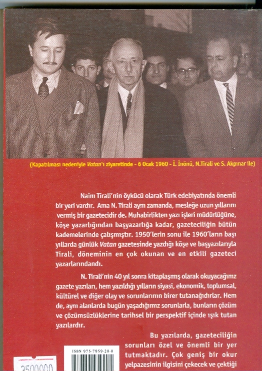 Okuyacağınız makaleler, Tirali'nin, yazar ve gazeteci olarak en olgun, en verim/i ve par/ak yıllarının ürünleridir. 1950'li, 60'lı yılların Vatan gazetesi Türkiye'nin en etkili, en çok okunan gazetelerinden; N. Tirali de o gazetenin etkili ve önde gelen yazarlarındandı.