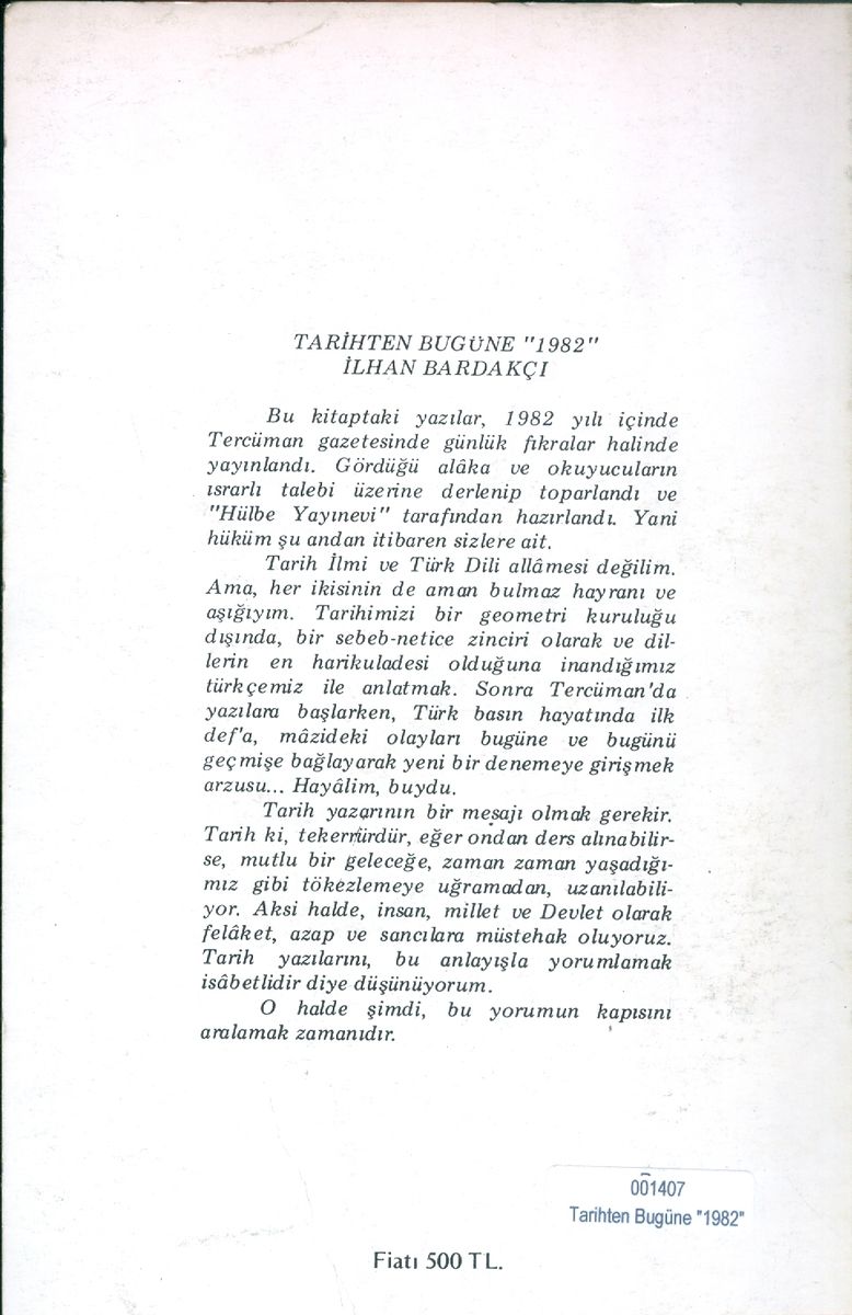Tarih yazarının bir mesajı olmak gerekir. Tarih ki, tekerrürdür, eğer ondan ders alınabilirse, mutlu bir geleceğe, zaman zaman yaşadığımız gibi tökezlemeye uğramadan, uzanılabiliyor. Aksi halde, insan, millet ve Devlet olarak felaket, azap ve sancılara müstahak oluyoruz. Tarih yazılarını, bu anlayışla yorumlamak isabetlidir diye düşünüyorum.