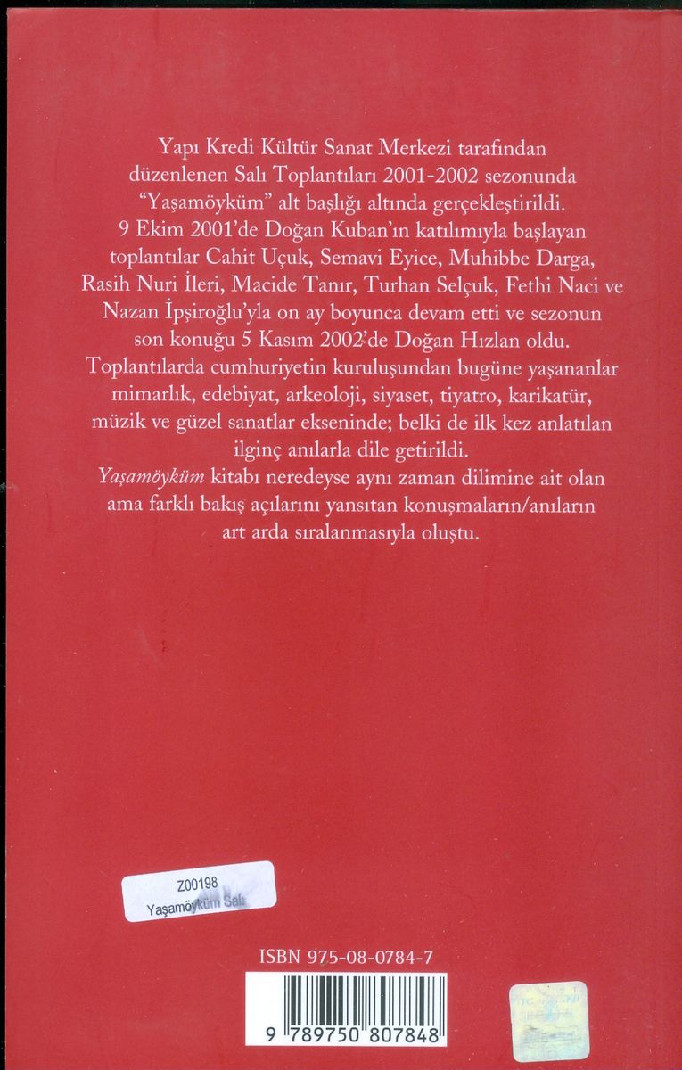 2001-2002 sezonunda Yapı Kredi Kültür Merkezi'nde Yaşamöyküm alt başlığı altında gerçekleştirilen Salı Toplantıları kitaplaştırıldı. Doğan Kuban, Semavi Eyice, Muhibbe Darga ve Doğan Hızlan'ın da katıldığı toplantılarda cumhuriyetin kuruluşundan bugüne yaşananlar, mimarlık, edebiyat, arkeoloji müzik ve güzel sanatlar ekseninde belki de ilk kez anlatılan anılar dile getirildi.