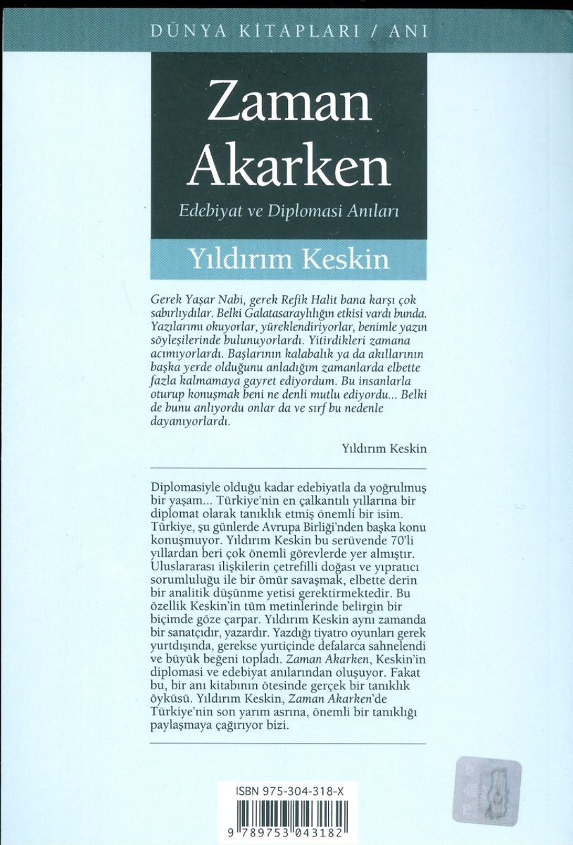 Bundan birkaç yıl önce de bir anı kitabı yayımlamıştım: Avrupa Yollarında Türkiye. Adından da anlaşılacağı üzere, daha çok diplomasi yaşantımın büyük bir bölümünü verdiğim, ülkemizin Avrupa Birliği ile ilişkilerinin başlangıcından bu yana gösterdiği gelişmenin öyküsü idi. Yer yer yazınsal etkinliklerimden de söz ediyordum. Ama niyetim, orada yalnızca değinerek geçtiğim ya da hiç değinmediğim olaylarla, adları geçen yazar, sanatçı ya da siyaset adamlarına ayrı bir kitapta yer vermekti. Zaman Akarken işte bu kitaptır.